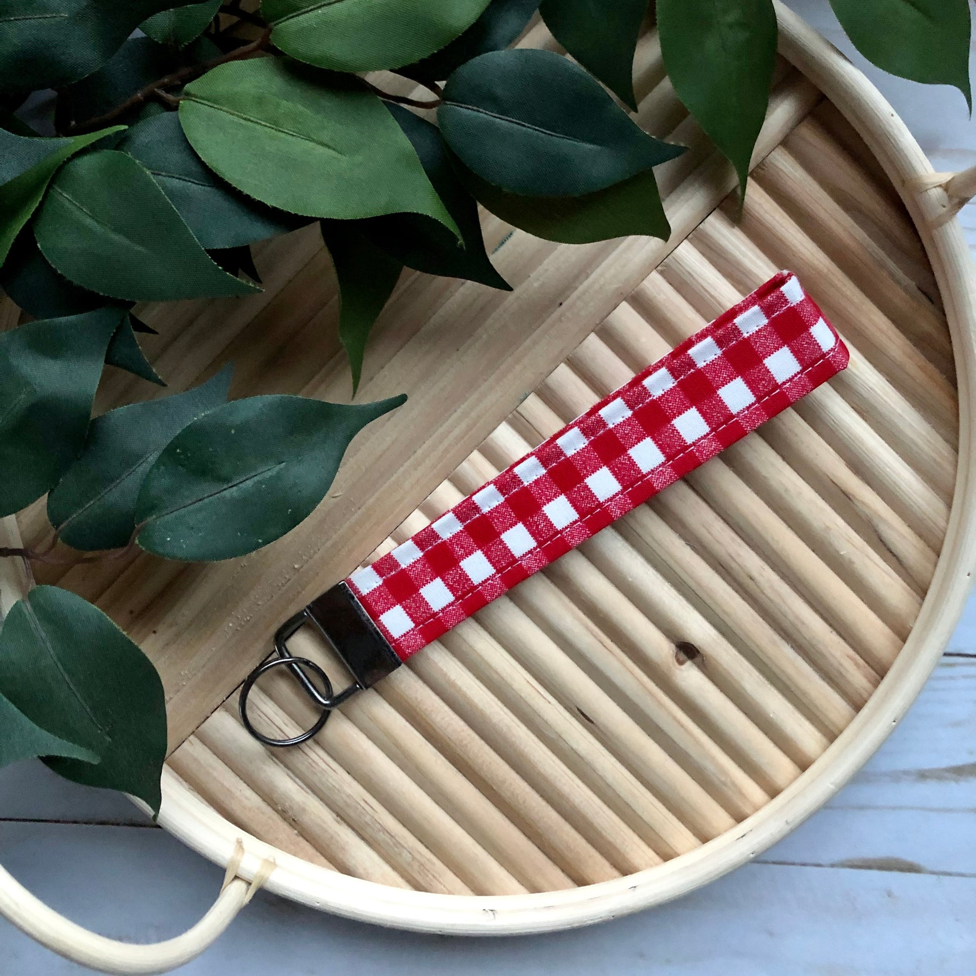 Farmhouse Red Gingham Print Fabric Wristlet Keychain, Key Fob