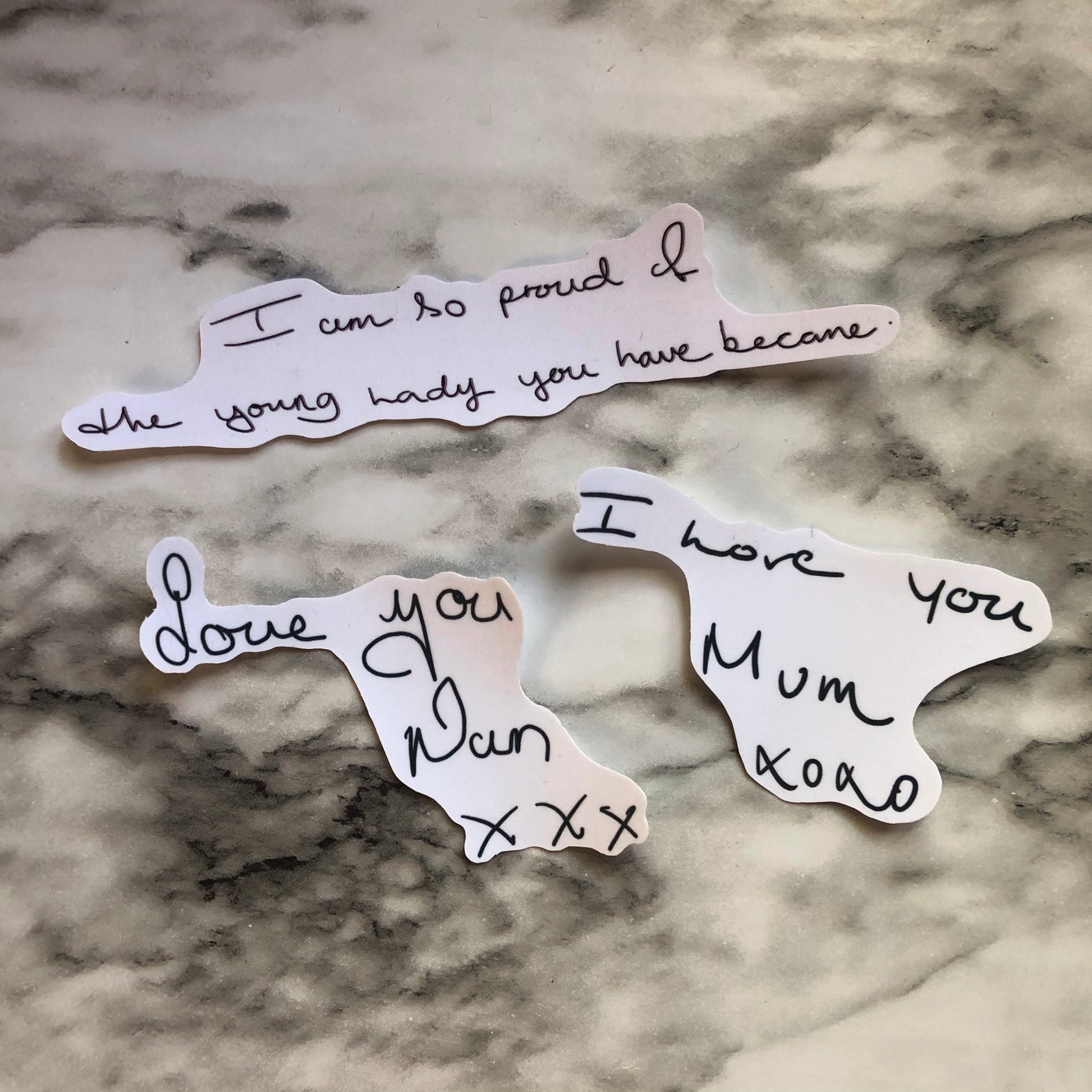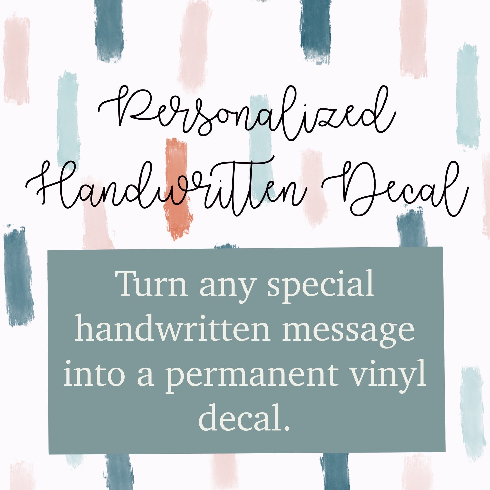 Once sent a picture of the handwriting message of your choice, I will convert that into a decal with permanent vinyl. Please make sure you send a clear picture and pick what size and color decal you would like.