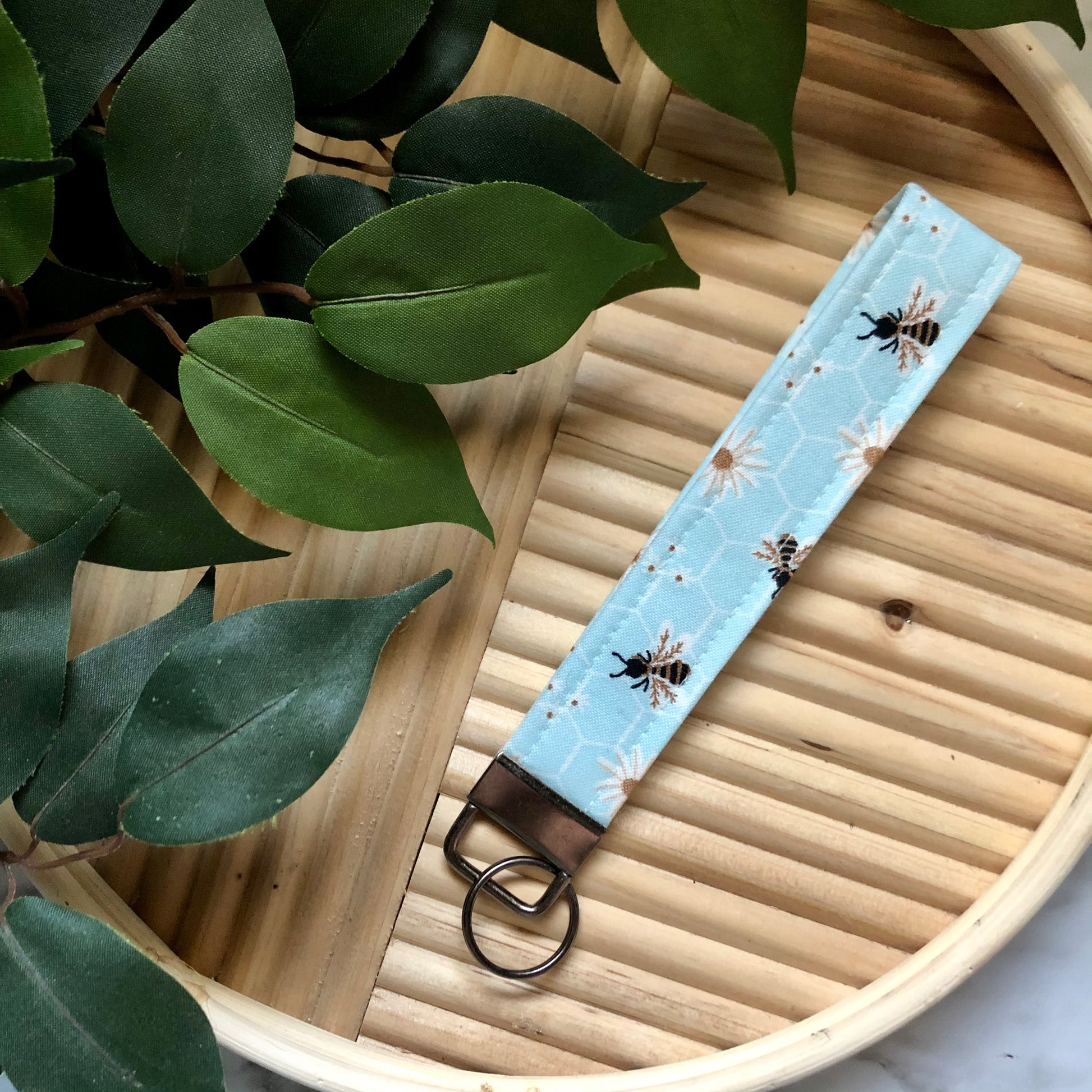 Daisies and Bees Blue Print Fabric Wristlet Keychain, Key Fob