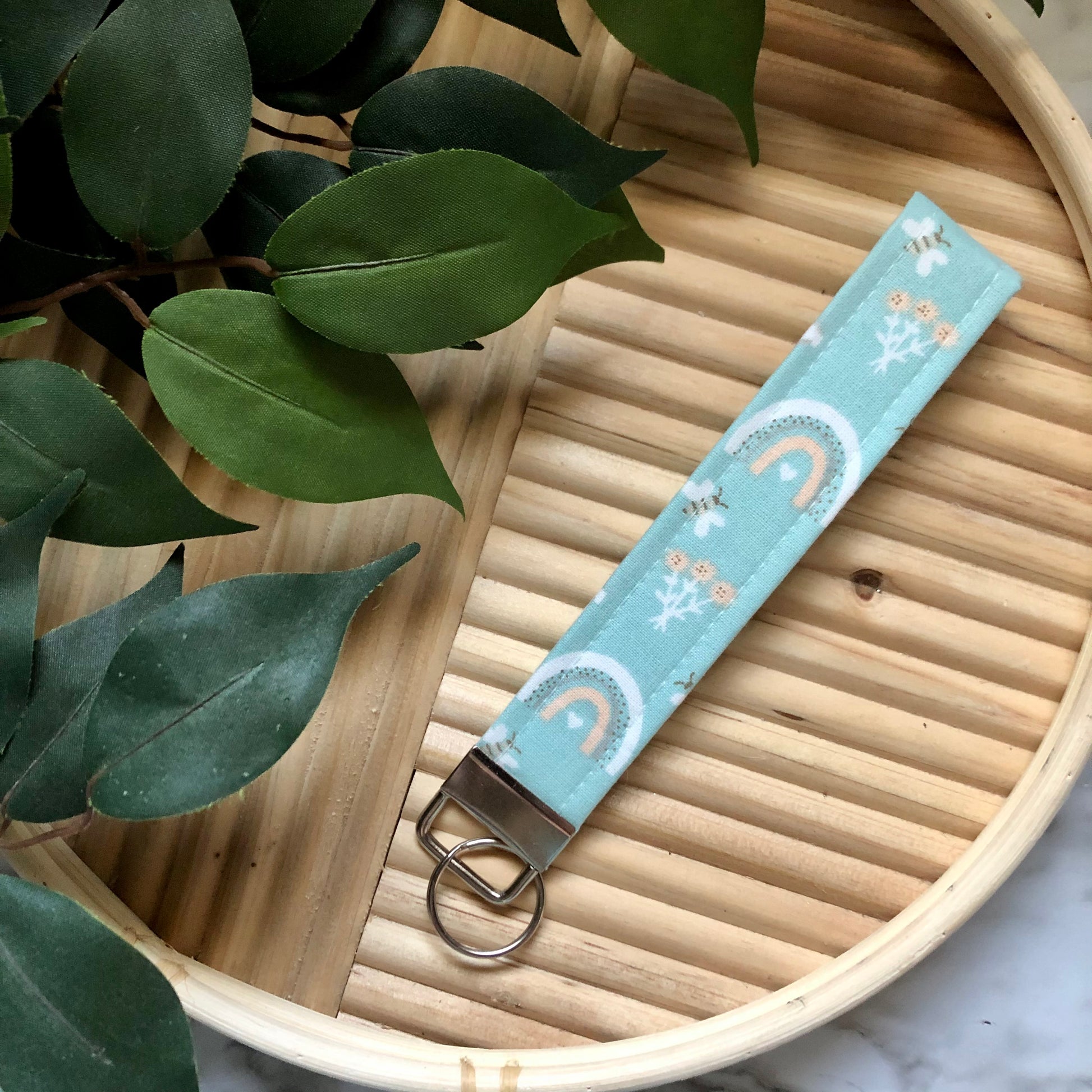 Rainbows & Bees Print Fabric Wristlet Keychain, Key Fob