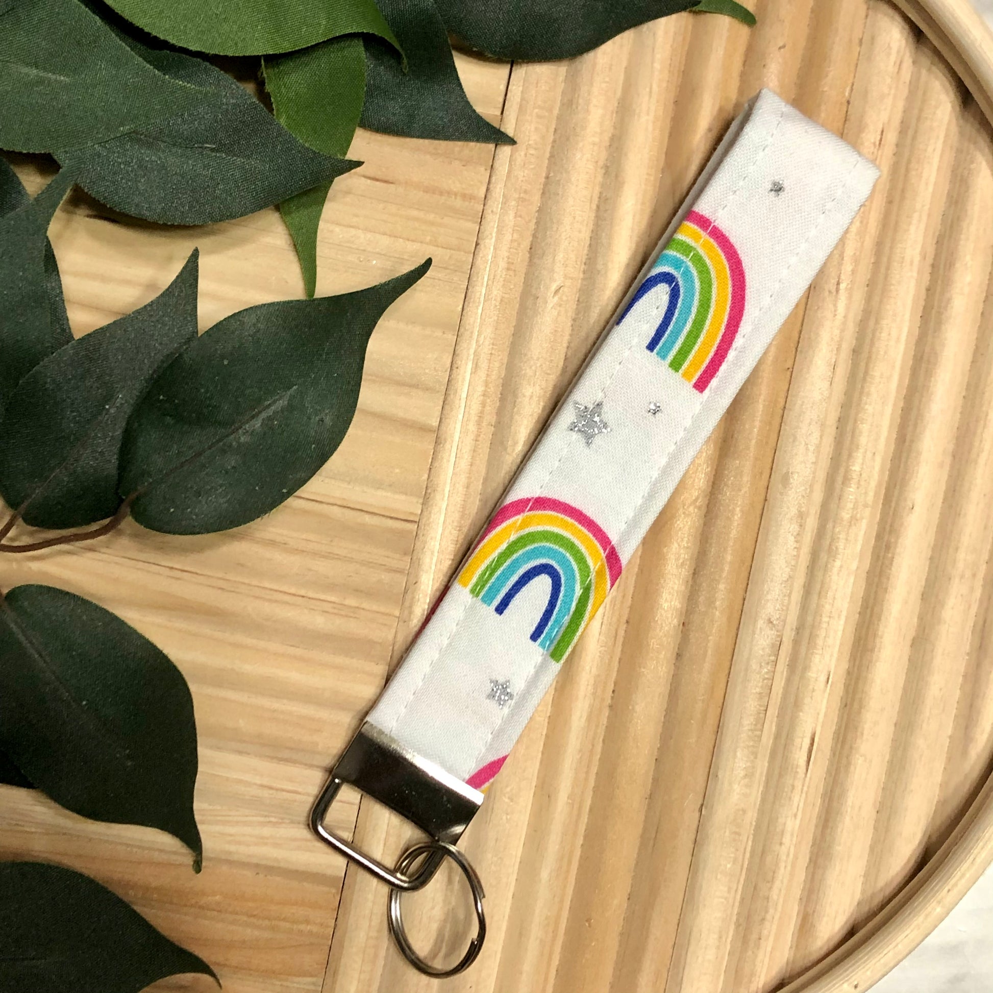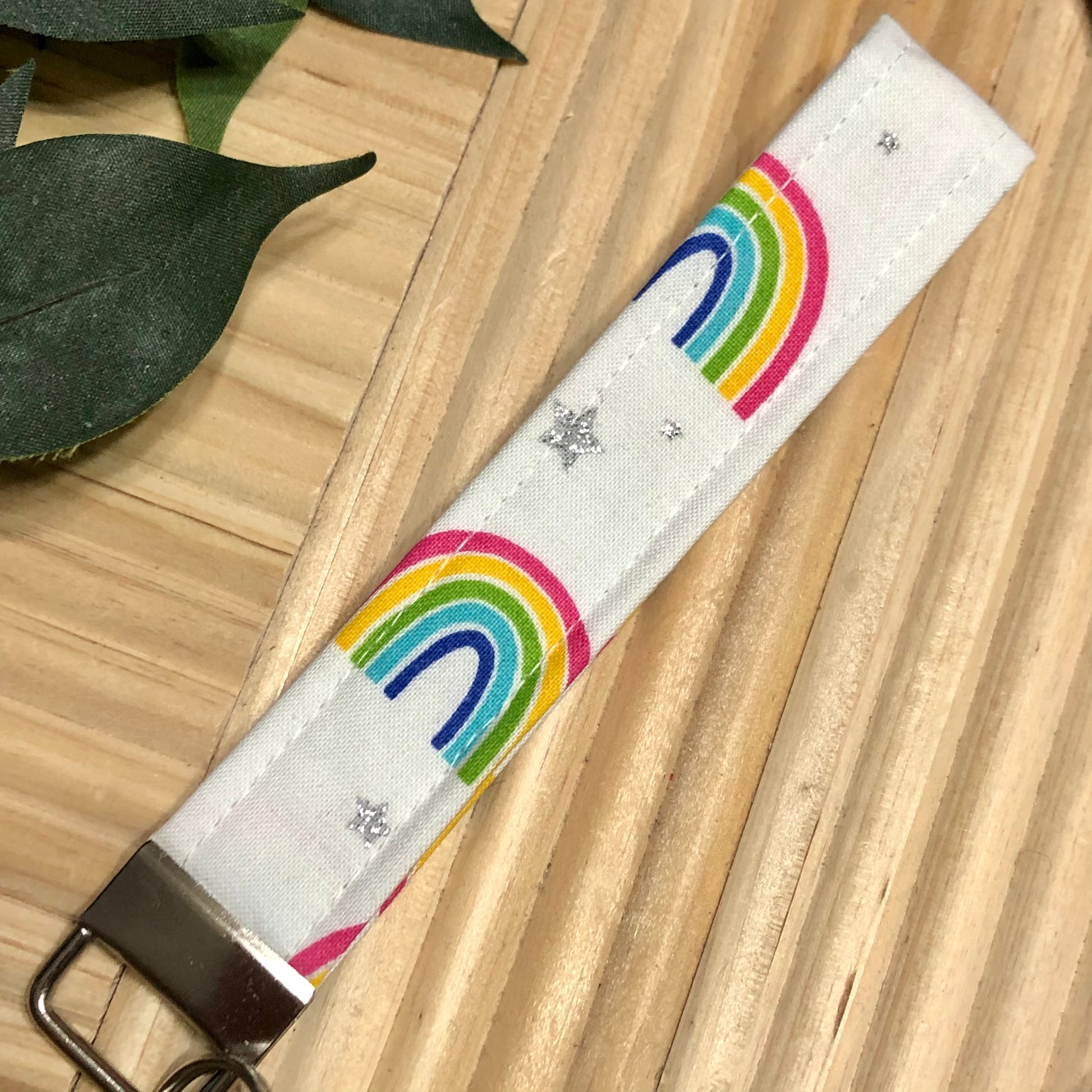 Glitter Stars & Rainbows Print Fabric Wristlet Keychain, Key Fob