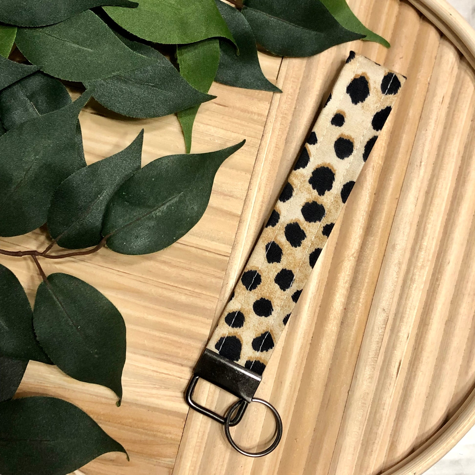 Natural Leopard Print Fabric Wristlet Keychain, Key Fob