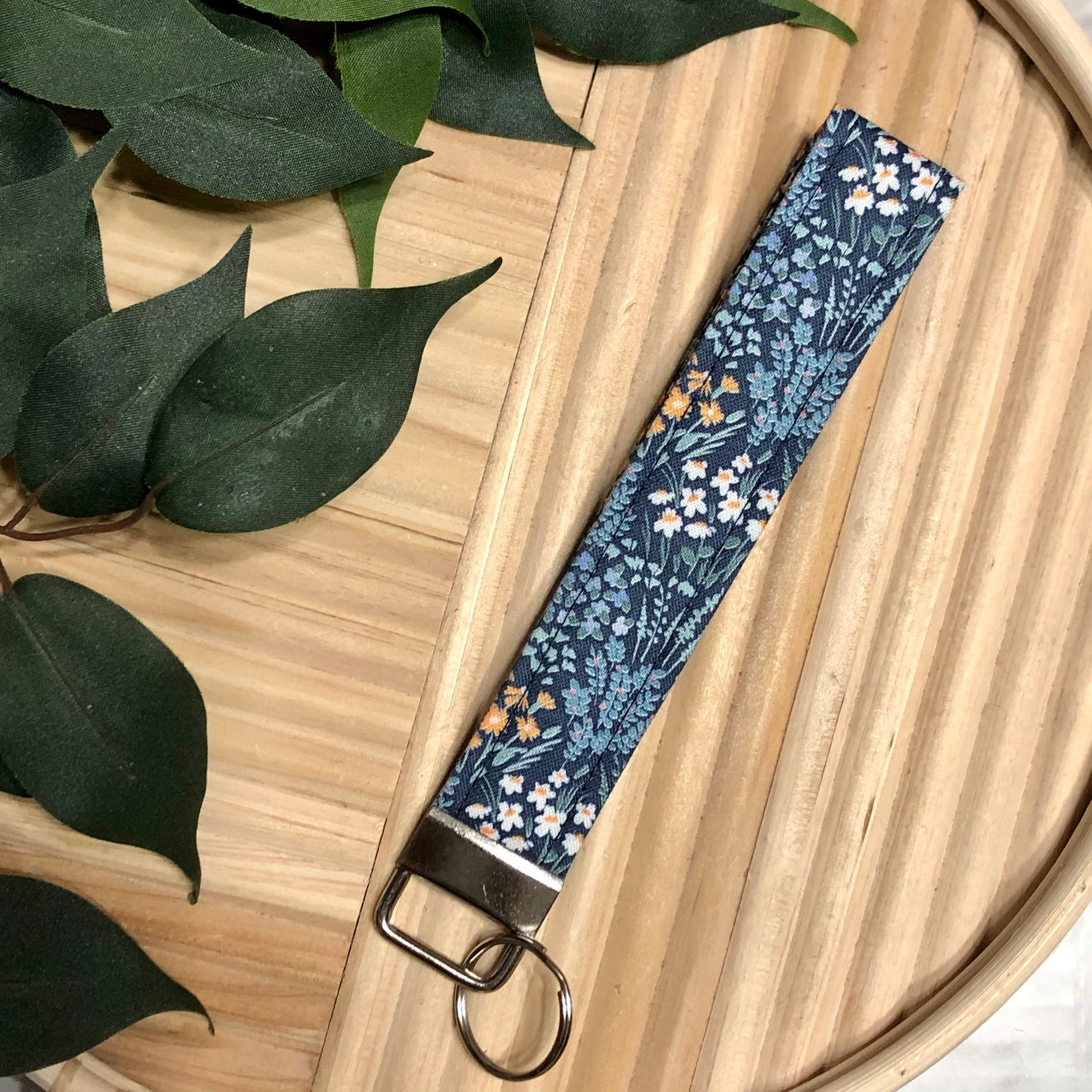 Navy Wildflower Print Fabric Wristlet Keychain, Key Fob
