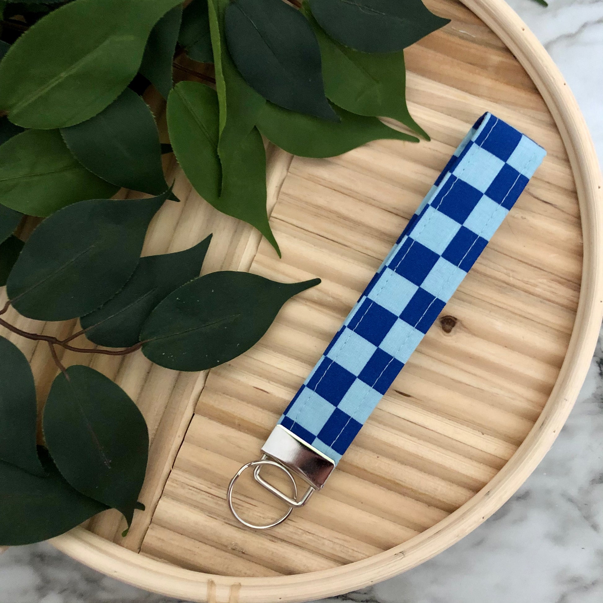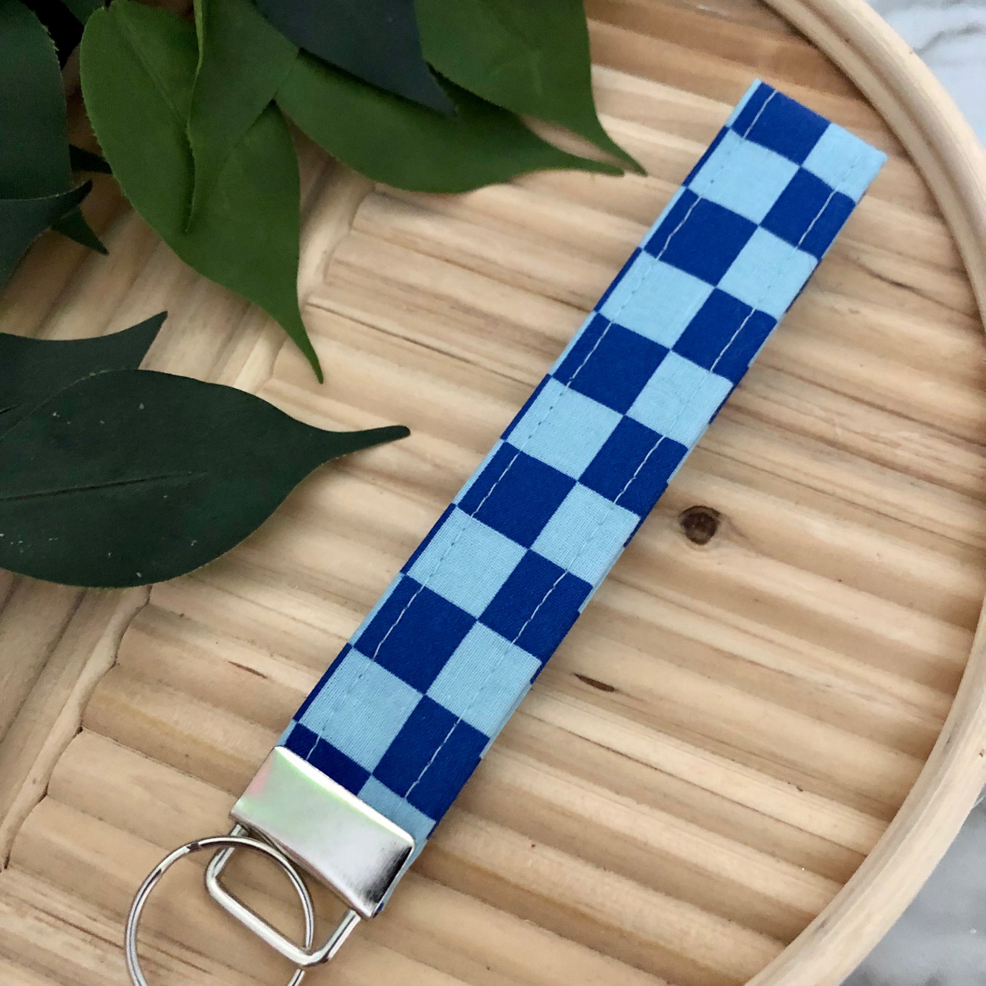 Blue Checkered Print Fabric Wristlet Keychain, Key Fob