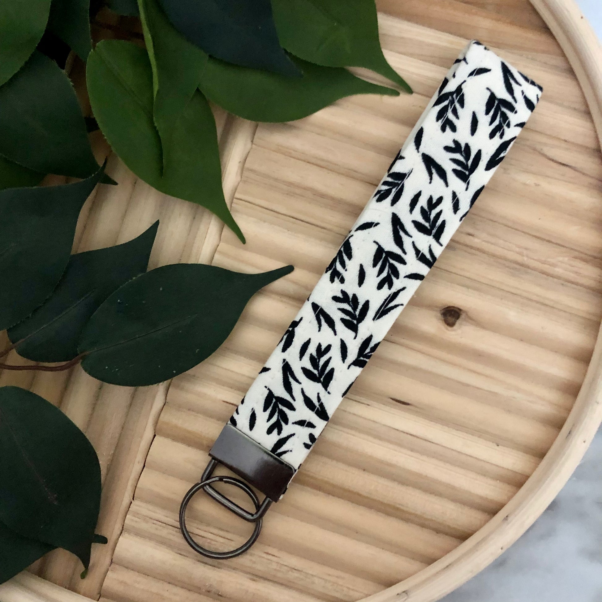 Cream and Black Leaf Print Fabric Wristlet Keychain, Key Fob