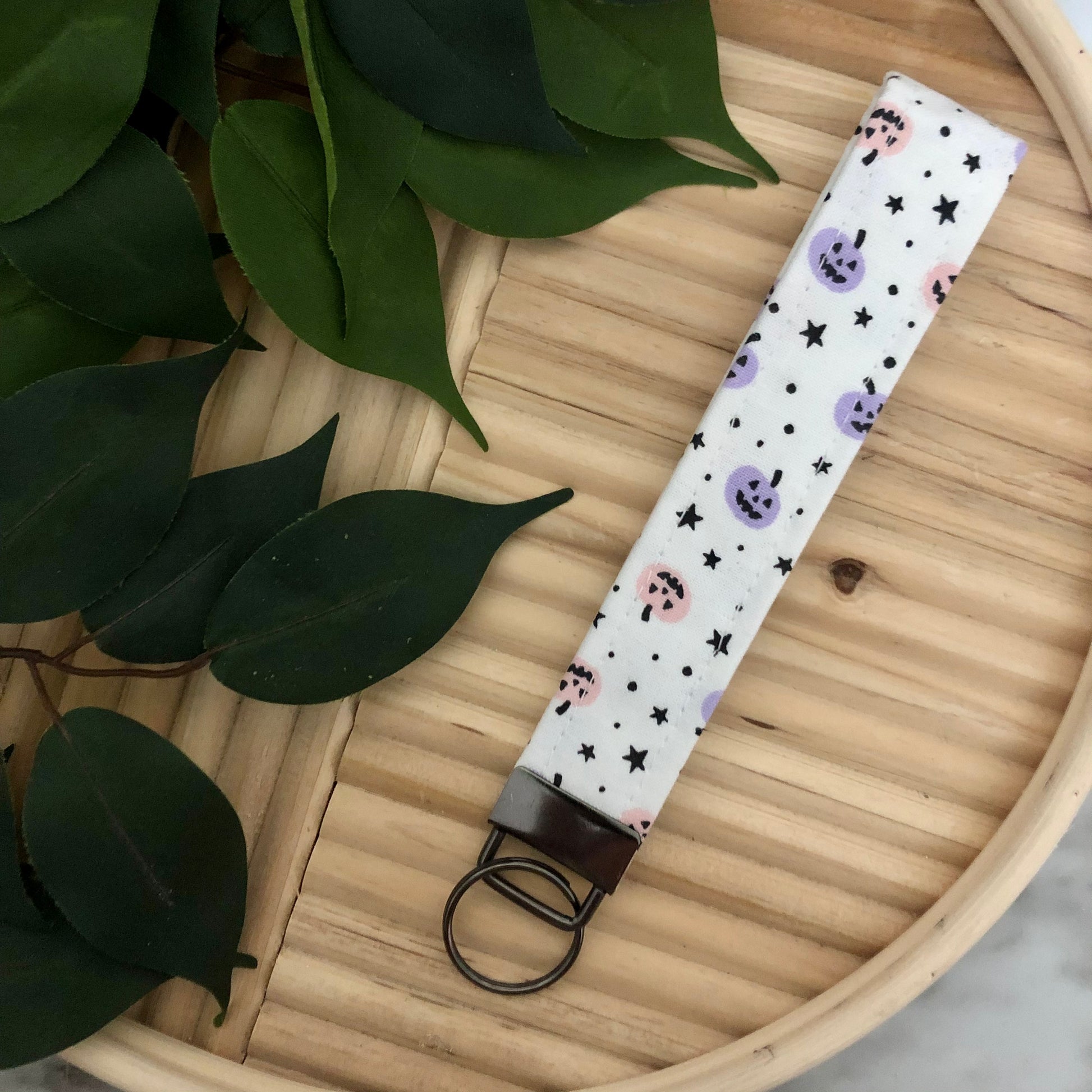 Pastel Jack O Lantern Print Fabric Wristlet Keychain, Key Fob