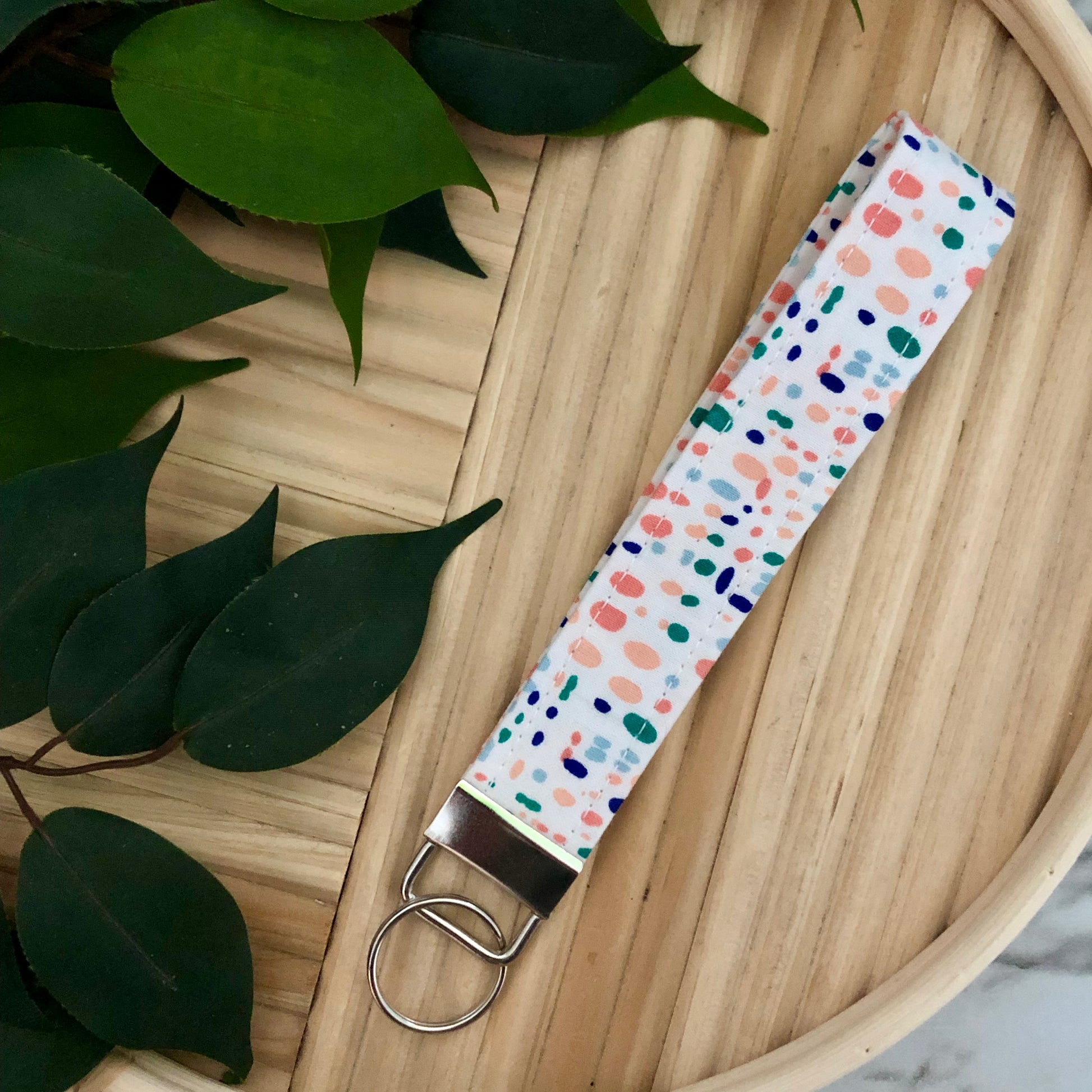 Pink/Blue/Green Dot Print Fabric Wristlet Keychain, Key Fob