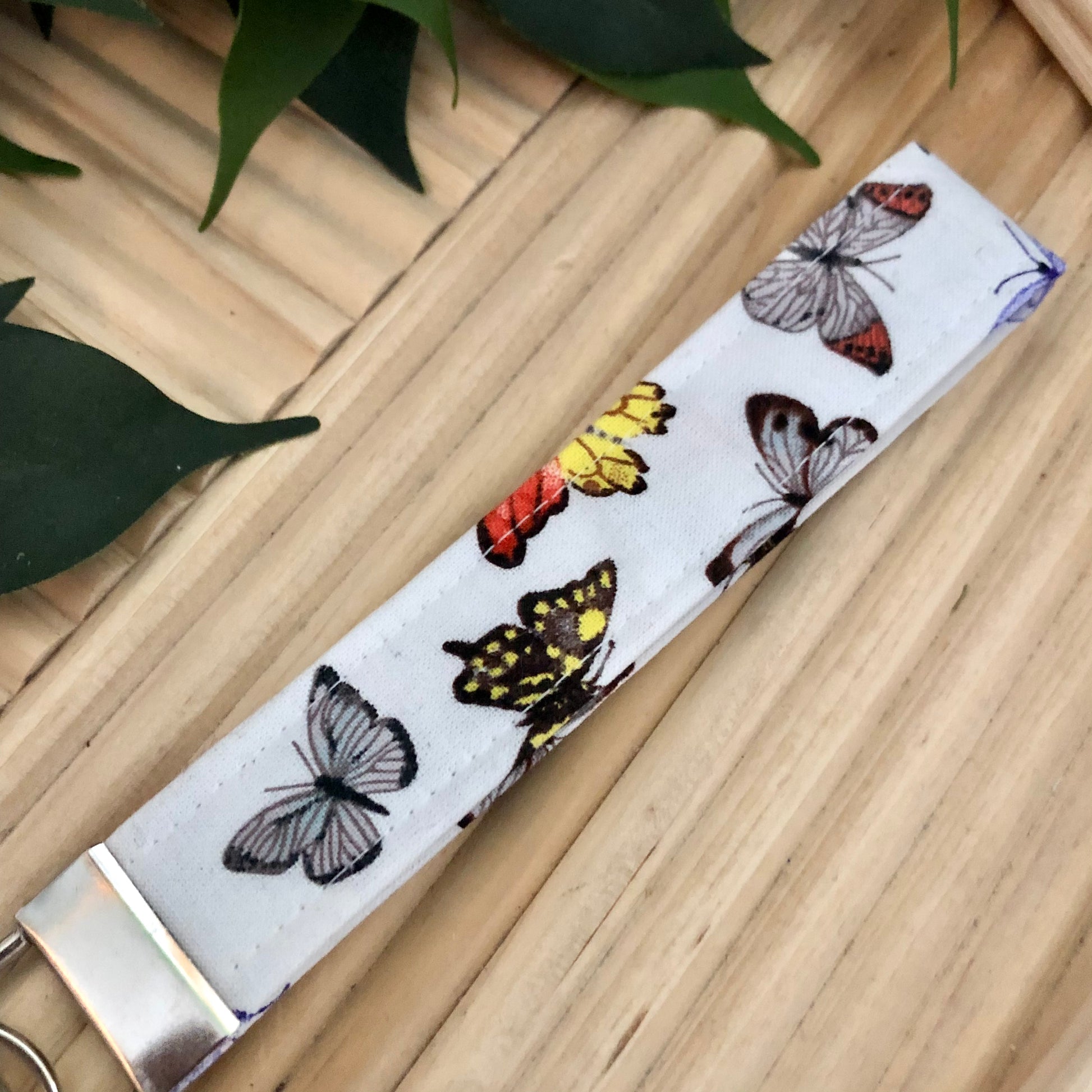 White Butterfly Print Fabric Wristlet Keychain, Key Fob