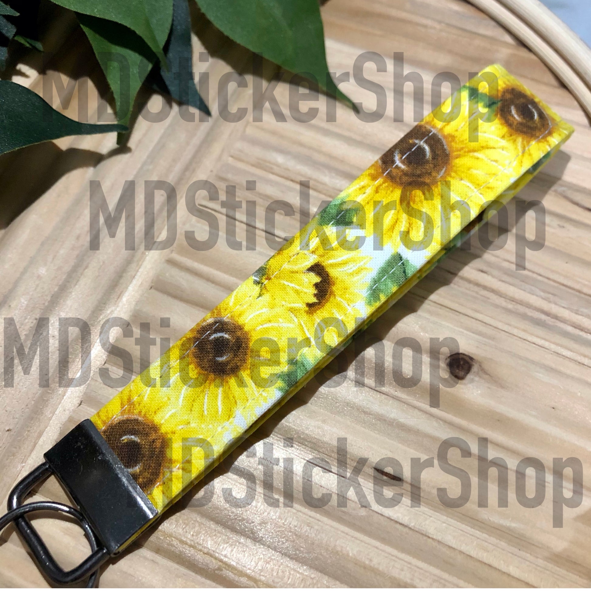 White Sunflower Print Fabric Wristlet Keychain, Key Fob